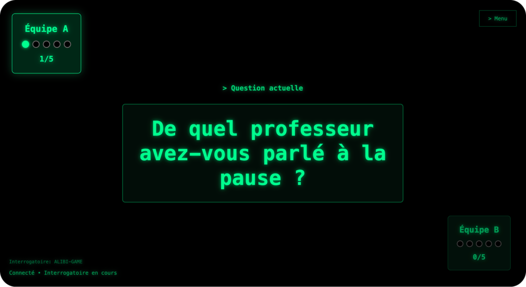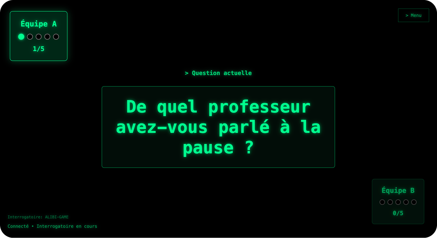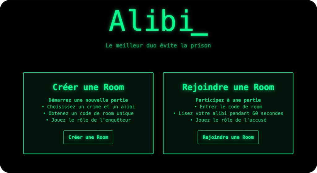 Alibi est un jeu multijoueur en temps réel développé pour la journée d’intégration 2025 de mon campus.