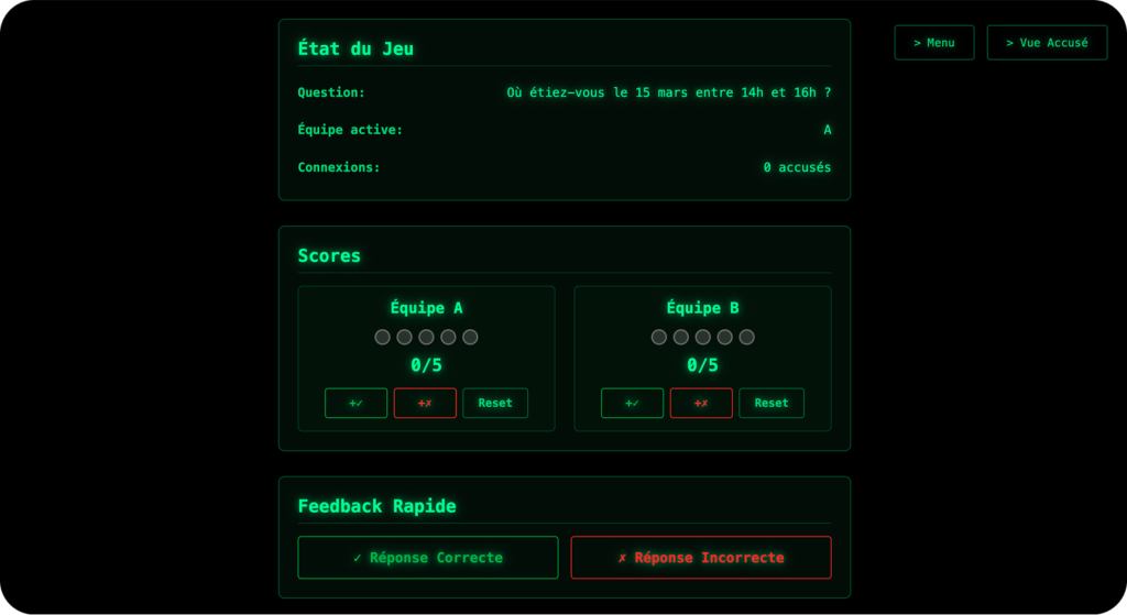 Quatre postes se connectent simultanément au même serveur : deux “accusés” et deux “enquêteurs”. Le premier enquêteur devient “maître du jeu” et peut contrôler en temps réel tout le jeu (écrire les prénoms des joueurs, afficher les alibis avec un chronomètre, attribuer des points aux joueurs, passer à la question suivante…).